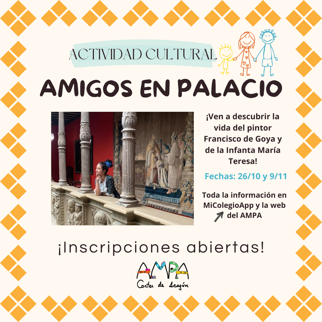 Os invitamos a la primera actividad cultura del AMPA en este nuevo curso. Vamos a descubrir la vida de dos grandes aragoneses: el pintor Francisco de Goya y la Infanta María Teresa, mediante la teatralización de una guía de la empresa Mandrágora. En el siguiente documento encontraréis toda la información de la actividad de forma extendida: Actividad Palacio Infanta 25-26 Inscripción: El plazo es desde hoy LUNES 6 de octubre hasta el DOMINGO 12 de octubre (ambos incluidos). Fuera de esas fechas no se admitirán nuevas solicitudes. Se realiza a través del acceso personalizado en la web del AMPA (con tu e-mail y contraseña). Detalles de la actividad: •Aforo máximo 30 personas. Una vez completado el aforo la web no permitirá reservar más entradas. •Lugar de realización: Patio de la Infanta, San Ignacio de Loyola, 16. Zaragoza. •Fechas: domingo 26 de octubre o domingo 9 de noviembre. A las 12 horas (estar en el lugar de realización 10 minutos antes). Hay que elegir un día, no se puede hacer la inscripción para ambas fechas. •Edades a quien va dirigida: La actividad está abierta a todo el alumnado escolarizado en el colegio, pero para el buen desarrollo de la actividad, la edad recomendada es de 5 a 10 años. •¿Quién puede asistir? Solo puede asistir 1 adulto por familia, de este modo hay más plazas para niños. •Precio: el AMPA subvenciona parte de las entradas, así que el precio final es de 4€ por persona para los socios del AMPA y 5,50 euros los no socios. Fechas de pago: Martes 21 y miércoles 22 de octubre. Mañanas: de 9:10h a 9:30h. Tardes: de 16:45h a 17:15h. Lugar: hall de primaria, junto al comedor. Os recordamos que es necesario estar al corriente de pago para disfrutar de las actividades que el AMPA organiza. Si tienes alguna duda puedes escribirnos a: ampacortesdearagon@gmail.com ¡NOS VEMOS EN EL PATIO DE LA INFANTA! Un saludo, AMPA Cortes de Aragón. Identificate para acceder a tu zona privada y ver el formulario de inscripción.