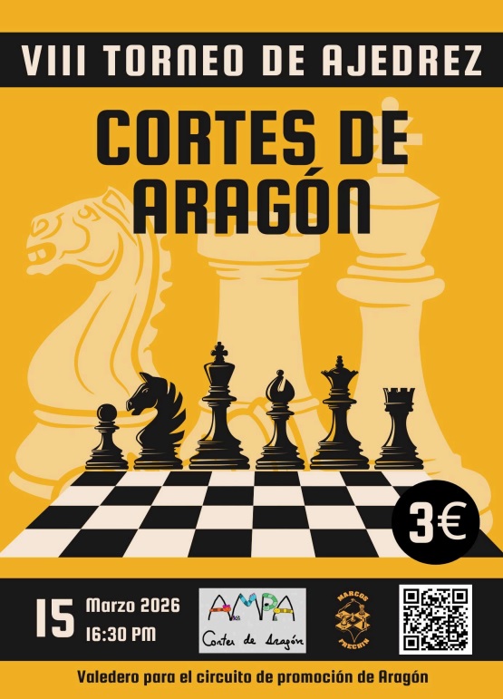 Tenemos el placer de invitaros a nuestro VIII Torneo Infantil de Ajedrez que se celebrará en nuestro colegio en colaboración con el Club de Ajedrez Marcos Frechín. Será el DOMINGO 15 de Marzo y dará comienzo a las 16.30h. El formulario de inscripción lo tenéis dentro de las BASES del torneo, que se encuentran aquí: VIII Torneo Infantil Cortes de Aragón 2026 Para cualquier duda, el contacto de referencia es: ajedrezfrechin@gmail.com ¡Un saludo y que tengáis un gran día! AMPA Cortes de Aragón. |