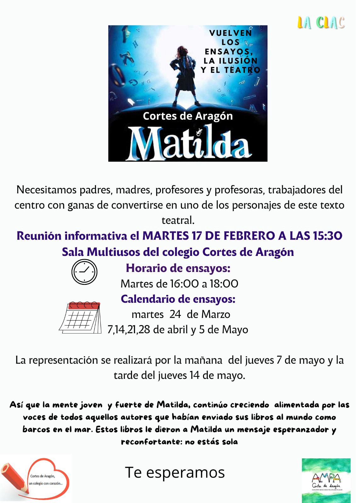 Un año más desde la AMPA ponemos a vuestra disposición las COLONIAS DE SEMANA SANTA en colaboración con nuestra empresa de extraescolares La Gymkana. Serán el 30 y 31 de marzo, y el 1 y 6 de abril, para todo el alumnado de nuestro centro. Adjuntamos la circular con toda la información necesaria (precios, fechas de inscripción, etc.,): Información colonias semana santa 2025-26 El último día para apuntar a los peques es el 20 de marzo. Para cualquier duda, la persona de contacto es Luis Arilla (629336372/contacto@lagymkanazgz.com). Un saludo y... ¡NOS VEMOS EN LAS COLONIAS! AMPA Cortes de Aragón. |